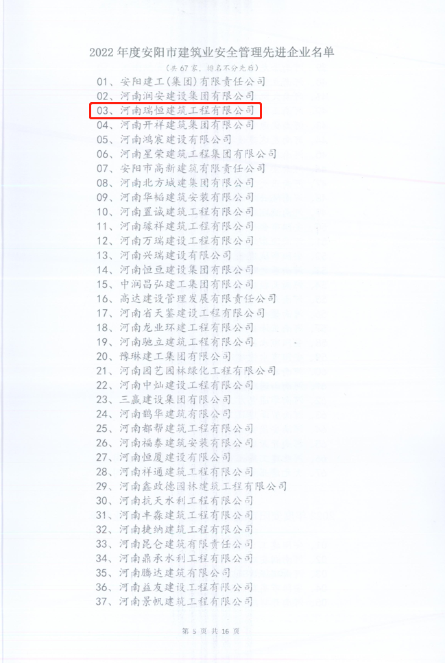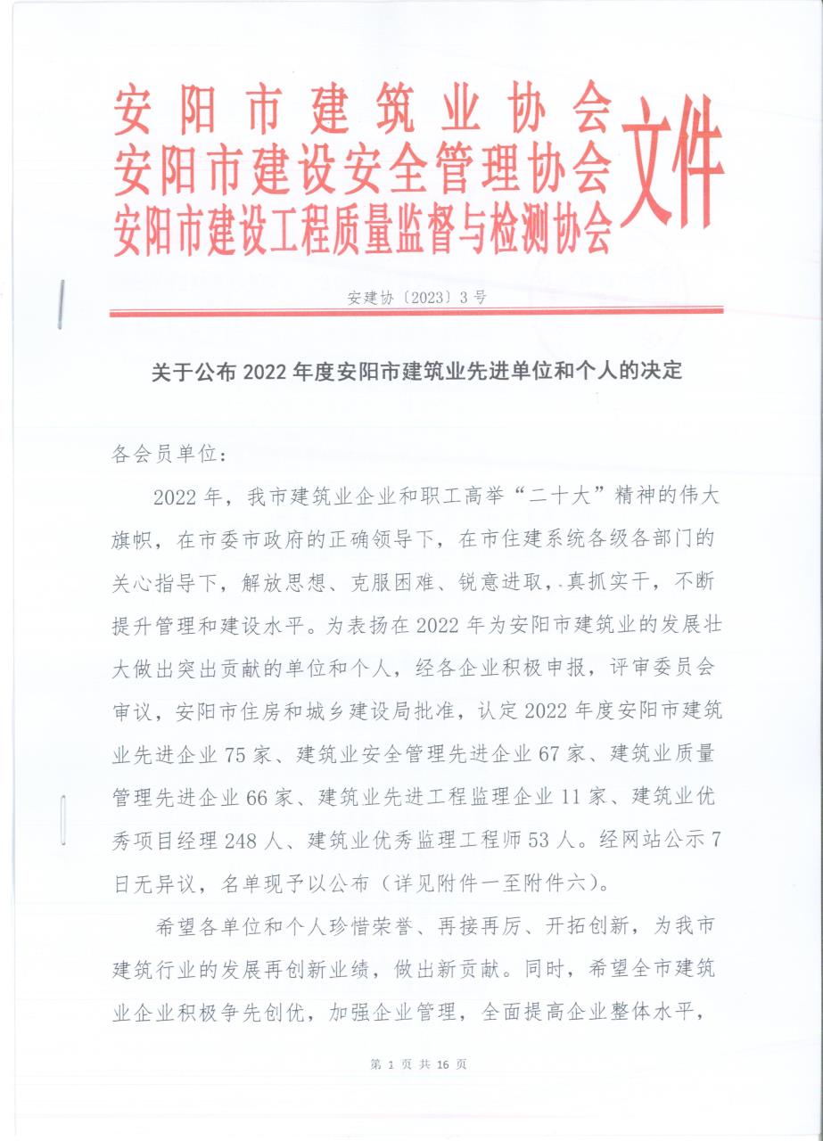 安陽市建筑業協會、安陽市建設安全管理協會、安陽市建設工程質量監督與檢測協會聯合公布“2022年度安陽市建筑業先進單位、優秀項目經理(建造師)”的通知,河南瑞恒建筑工程有限公司再次榮獲2022年度“安陽市建筑業先進企業”、“安陽市建筑業安全管理先進企業”、“度安陽市建筑業質量管理先進企業”和數名優秀項目經理,我司建造師馬艷紅、張富芹、魏艷玲、徐翊君、魏新、單意超、宋賓賓、朱志剛、華英麗、王雨等十人也榜上有名。